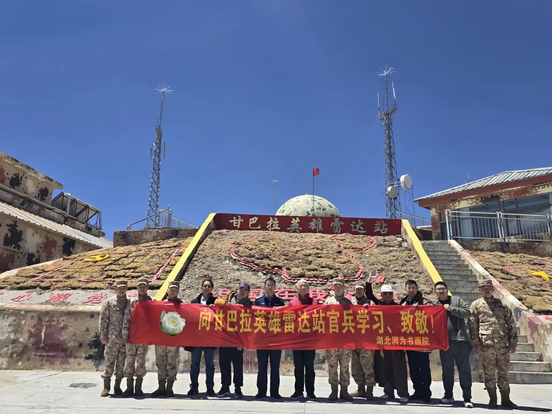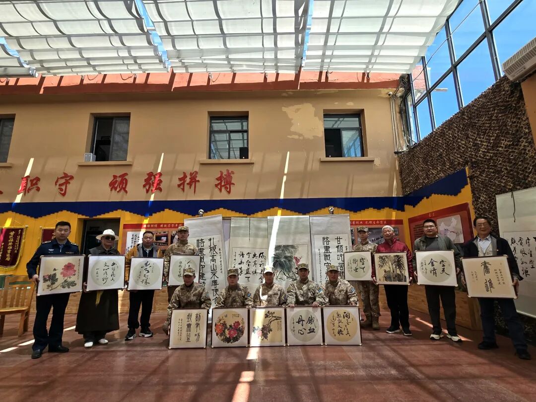 捐赠结束后,鄢献民不顾高原反应,执意登上海拔5374米的甘巴拉英雄雷达站。这是他心心念念的一个雷达站,是中央军委命名的空军甘巴拉英雄雷达站,也是他任空军雷达学院政治部主任时″三观”教育的活教材和挂钩先进单位。17年前,他随队调研时,曾被他们“甘愿吃苦、默默奉献、恪尽职守、顽强拼搏”的奉献精神和乐观的状态深深震撼。此次重访,他带领平均服役30年以上的退役老兵团队,连夜创作《空天金睛》《铁血丹心》等20余幅作品,用笔墨传递信仰的温度,用书画向坚守高原的战友致敬,受到雷达站官兵的热烈欢迎。