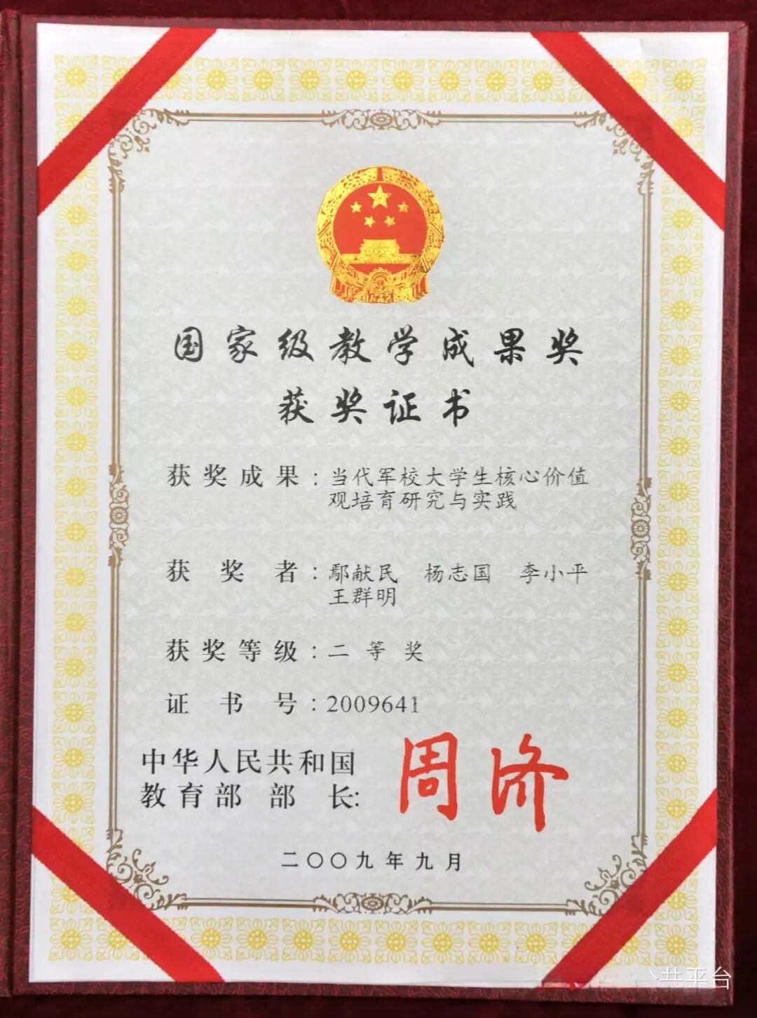 ▲2009年鄢献民获国家级教学成果二等奖