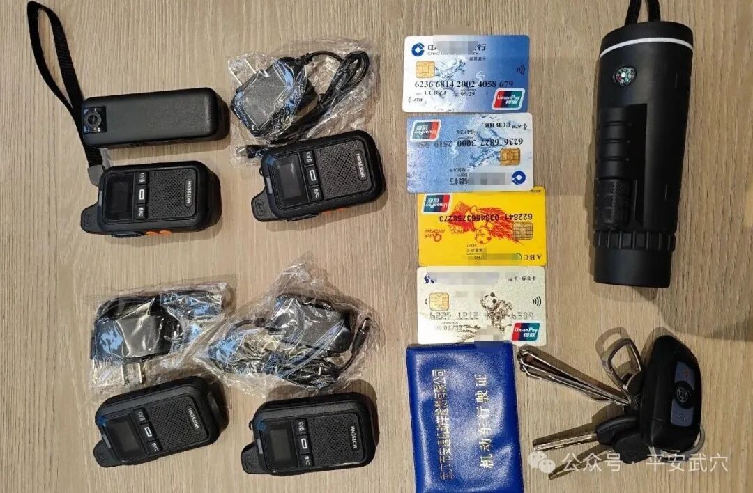 5月22日,当犯罪团伙再次现身时,抓捕民警兵分两路,在花桥镇成功抓获犯罪嫌疑人田某、陈某、陈某某、戴某、张某,现场查扣作案小车一辆,作案工具对讲机4台、银行卡4张、望远镜1个。