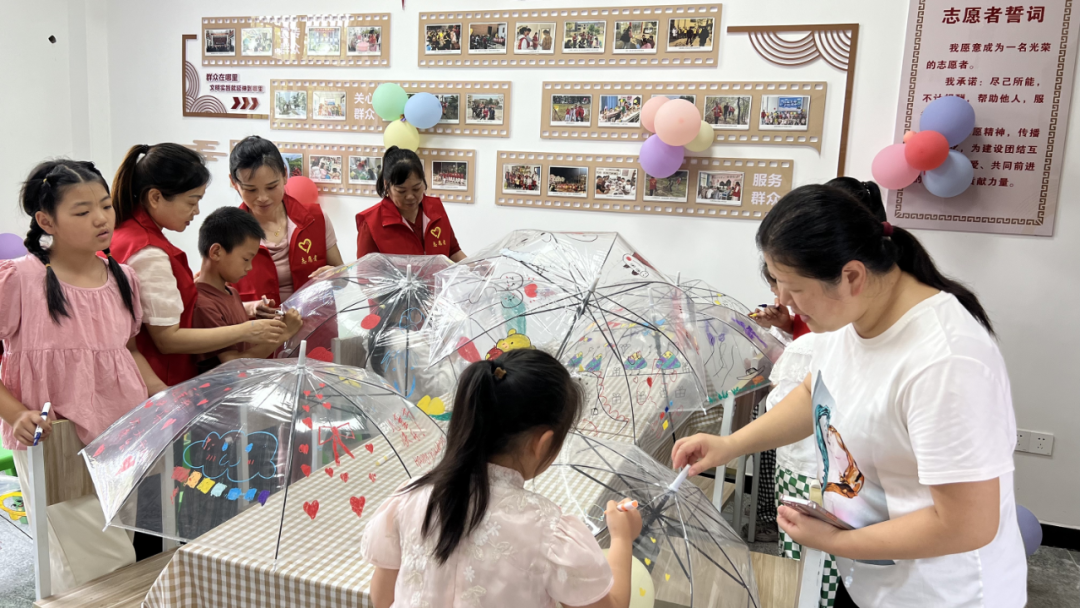 彩笔绘伞,让童趣在伞面绽放。孩子们手握彩笔,在爱心妈妈与社工的指导下,在透明伞面上勾勒彩虹、花朵等创意图案。伞下的笑脸与缤纷涂鸦相映成趣,激发了孩子们的审美创造力。