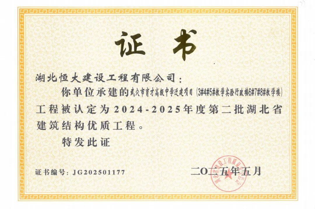 匠造城市精品,“质”敬美好生活。近日,湖北省《2024-2025年度第二批湖北省建筑结构优质工程项目评审结果公示》发布,由湖北恒大建设集团承建的武穴市育才高中迁建项目,入选2024~2025年度第二批湖北省建筑结构优质工程项目名单,荣膺“湖北省建筑结构优质工程”称号。此次获奖,展现出恒大集团在品质建造、文明施工、智慧工地等领域的过硬实力和技术优势。