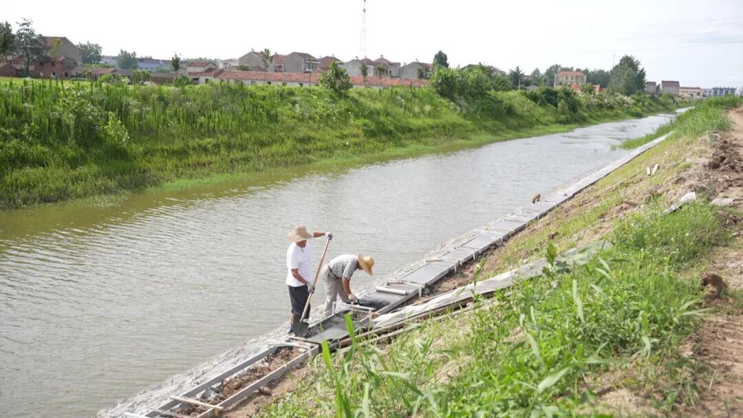 近日,记者来到武黄湖泵站看到,工人们正在对泵站周边破损堤坝进行混凝土浇填。一旁,大型挖掘机声音轰鸣,一派热火朝天的景象。