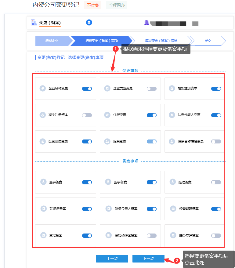 4.办理人员根据企业实际情况,选择变更及备案事项,完成后点击“下一步”。