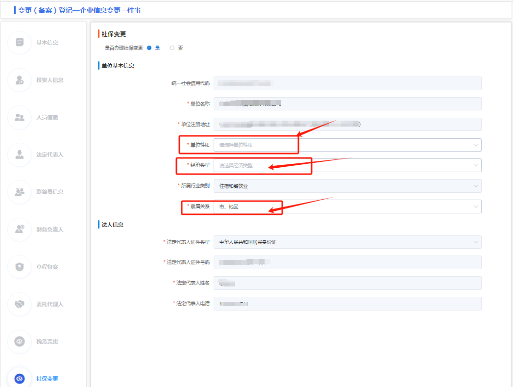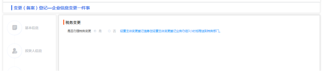 ①税务变更:在变更登记业务办结后三小时自动推送至税务部门,社保变更选择相应的信息后,点击“下一步”。
