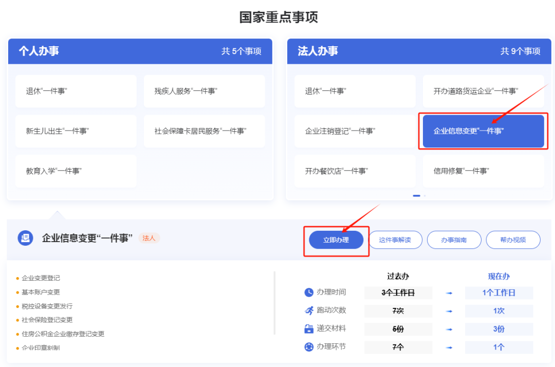 2.进入政务服务网“高效办成一件事”专区,在“国家重点事项”法人办事专栏找到企业信息变更“一件事”,点击“立即办理”,根据提示选择对应区划进行申报。