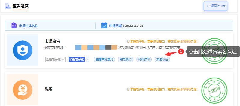 2.选择半程电子化:提交需要将生成材料打印下来到窗口提交,并通过实名认证APP对相关人员进行实名认证。