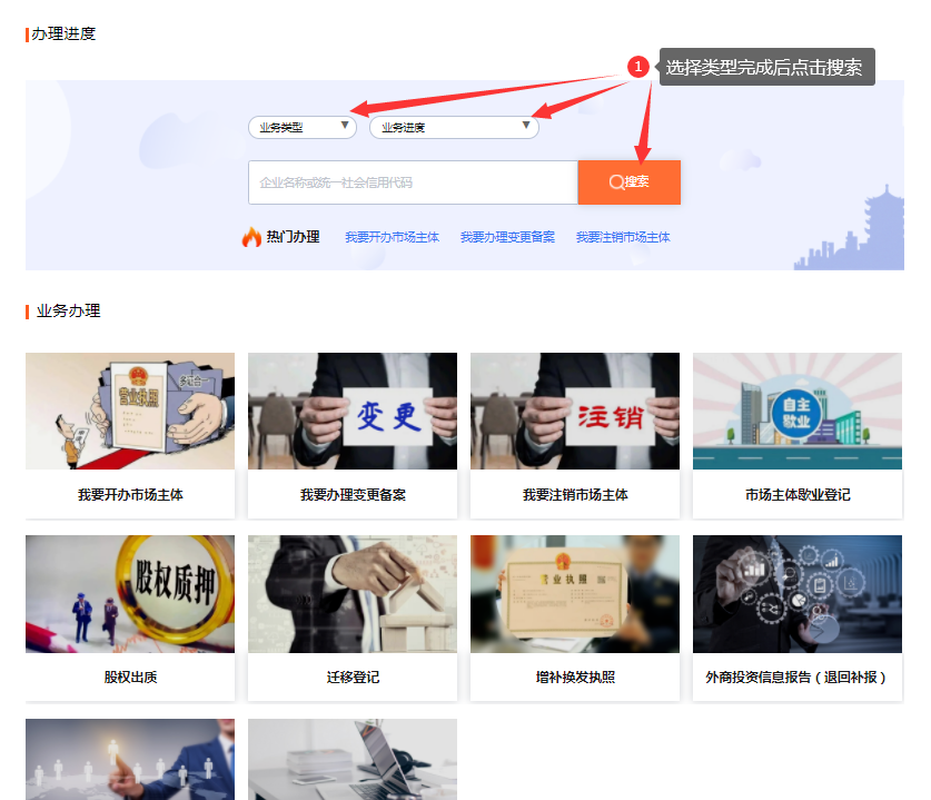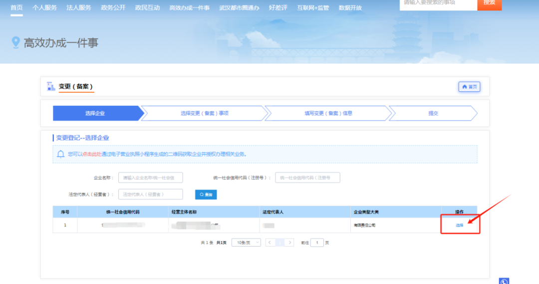 3.进入企业选择页面,通过输入企业名称/统一社会信用代码/法定代表人进行查询,选择需要进行变更登记的市场主体。