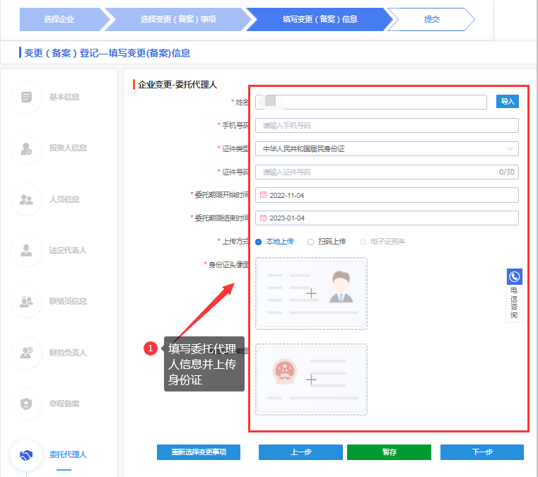 8.按照提示填写办事人员的相关信息并上传其身份证正反面照片。(需显示证件四个角,且图片清晰)