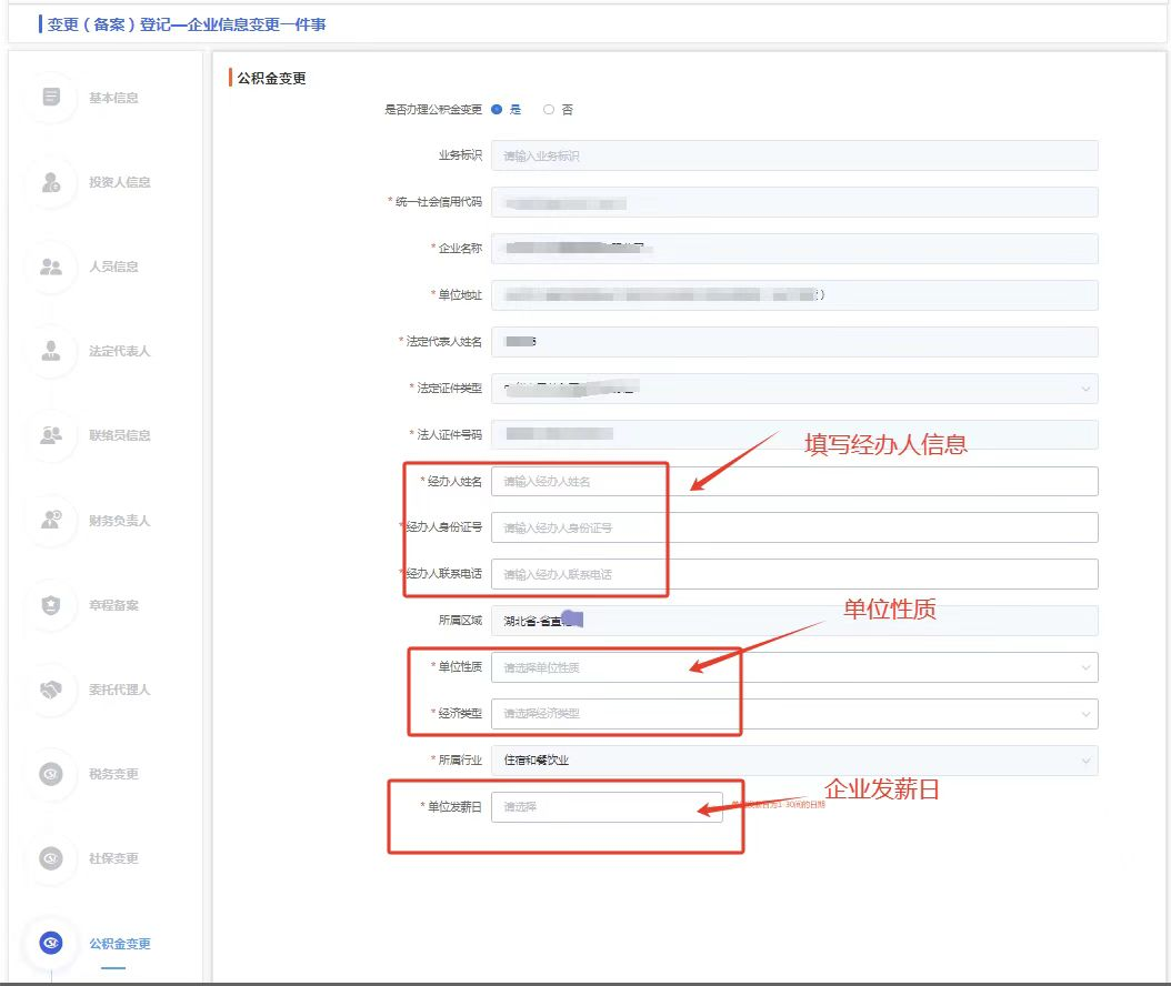 ②公积金变更:需填写经办人信息以及电话号码,单位性质及发薪日。