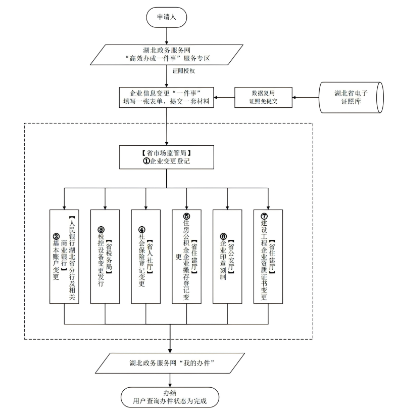 您可登录“湖北政务服务网”,进入 “高效办成一件事”专区,选择“企业信息变更‘一件事’”,按照系统提示进行在线申报。办理结果可通过平台实时查询。