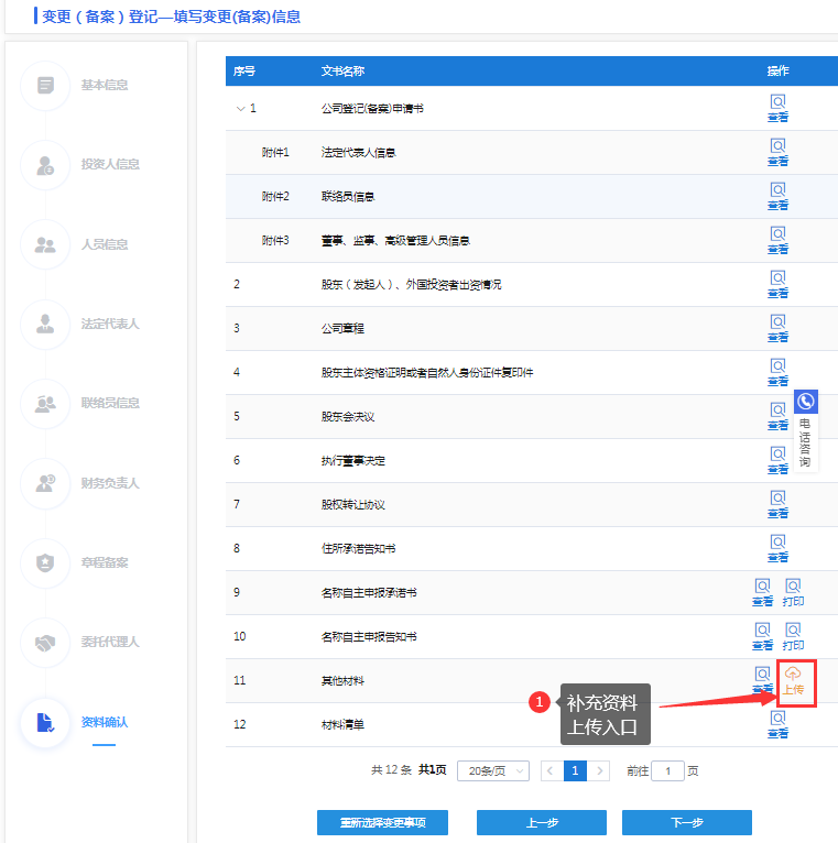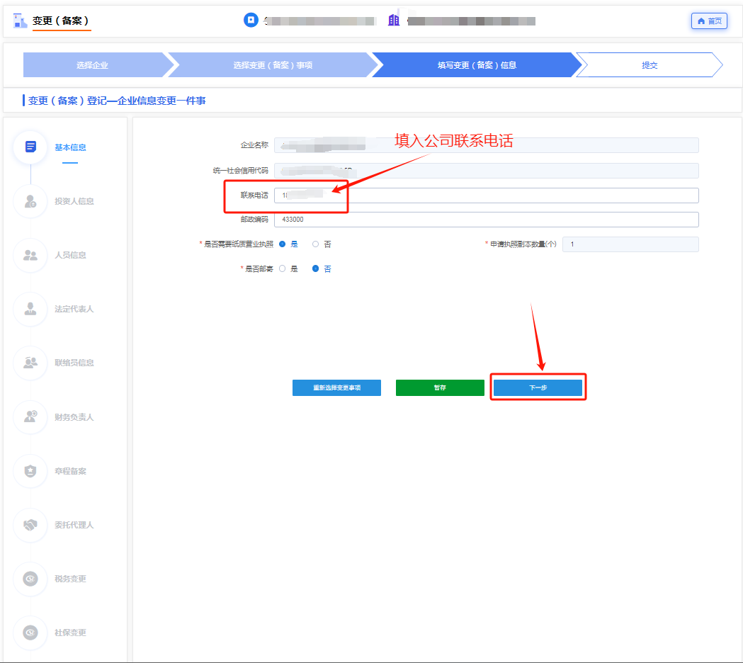 5.完成变更/备案选择后,依次填入公司联系电话后点击“下一步”。