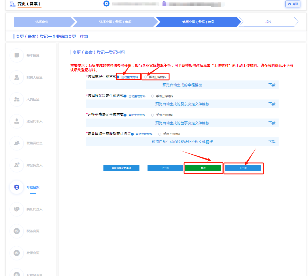7.当企业变更/备案信息填写完成后,企业章程以及股东会决议或股东决定,股权转让协议等信息,企业可上传自行准备的文件或由系统自动合成,可以进行暂存操作,信息确认后点击“下一步”。