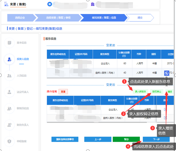 6.根据企业所需变更内容进行准确的信息填写,例:该企业进行股东变更并增资业务,首先录入新股东信息,然后再点击股权转让进行信息填写,再录入增资信息信息填写确认后点击“下一步”。
