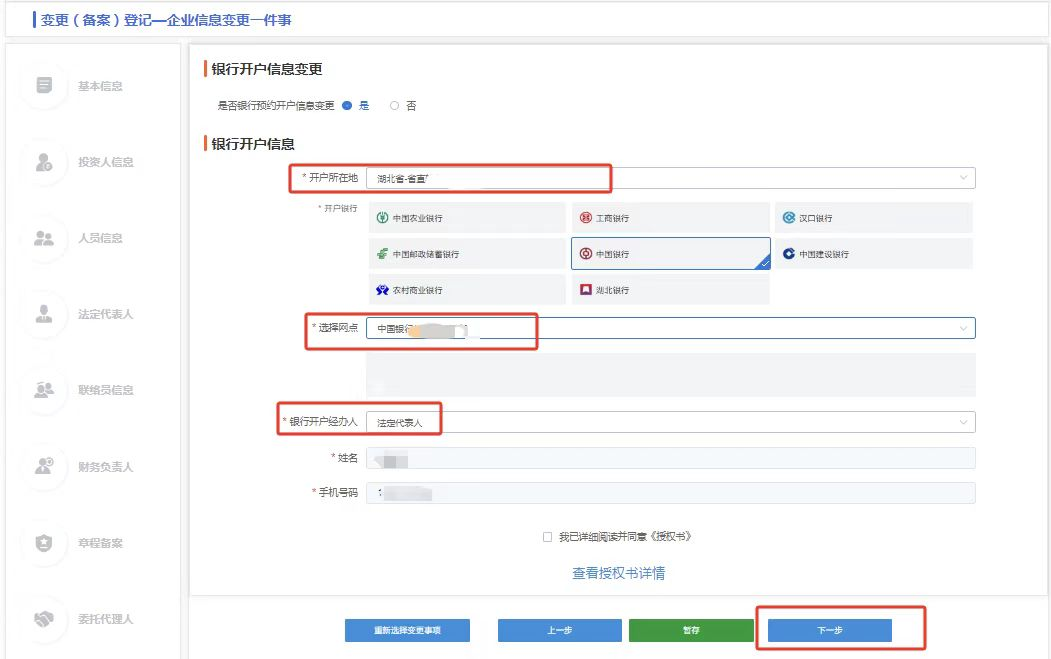 ③银行变更:选择开户行所在地并选择对应网点,填写银行开户经办人后点击“下一步”。