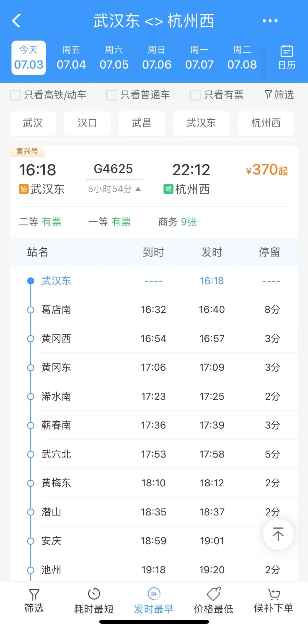 武汉东站始发列车经停葛店南、黄冈西、黄冈东、浠水南、蕲春南、武穴北、黄梅东、潜山、安庆、池州、九华山、黄山北、歙县北、三阳、千岛湖、桐庐东等16站,杭州西站始发列车经停桐庐东、千岛湖、黄山北、安庆、宿松东、蕲春南、浠水南、黄冈东等9站,串联湖北、安徽、浙江,实现跨省高铁运行,光谷地区乘客往返杭州将更便捷。