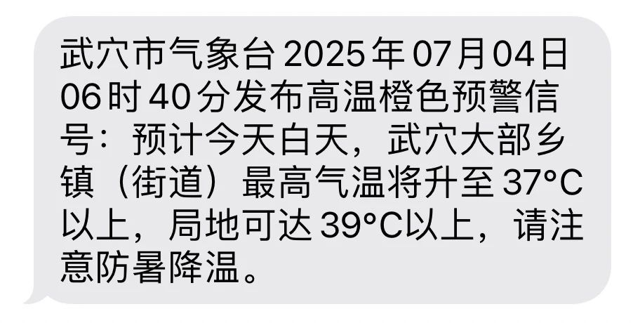 武穴市气象台2025年07月04日06时40分发布高温橙色预警信号:预计今天白天,武穴大部乡镇(街道)最高气温将升至37℃以上,局地可达39℃以上,请注意防暑降温。