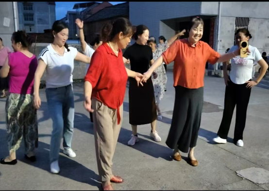 每当夕阳给天空染上胭脂色,文化活动中心的广场便热闹起来。身着轻便服装的女士们三三两两结伴而至,有人初来乍到略显羞涩,有人早已按捺不住兴奋。随着领舞的节奏响起,大家舒展肩臂、迈开步伐,“左一步,右转身”的提示声与欢快的鼓点交织,笑声在空气中荡漾,比往日的闲聊更显鲜活。