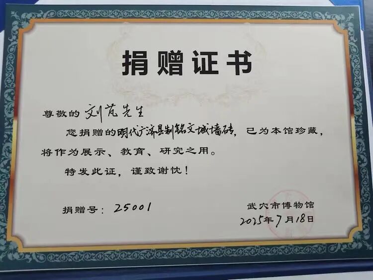 7月18日,武穴籍美国侨胞刘芃教授向武穴市博物馆无偿捐赠了一块明洪武时期黄州府广济县奉旨烧制的南京古城墙贡砖。据文博专家研究,这块古砖对于考证明代南京都城建设和广济县历史文化具有重要意义。
