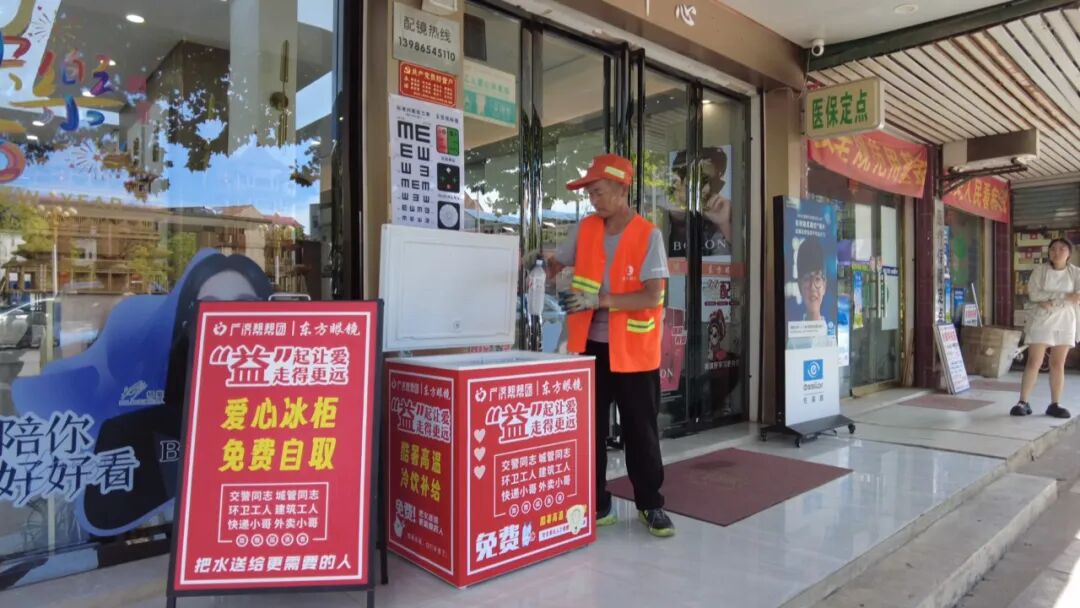 近日,记者在永宁大道一家眼镜店前看到,一台贴着“爱心冰柜 免费自取”标语的冰箱靠墙放着,店老板陈猛正利落地擦拭冰箱表面,又把一瓶瓶冰水码齐。