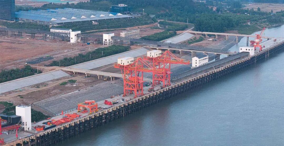 7月25日,在武穴市长江边,武穴铁水联运综合码头5号泊位在进行带货调试,标志着这个国内首个投建营一体化的铁水联运项目通过交工验收。