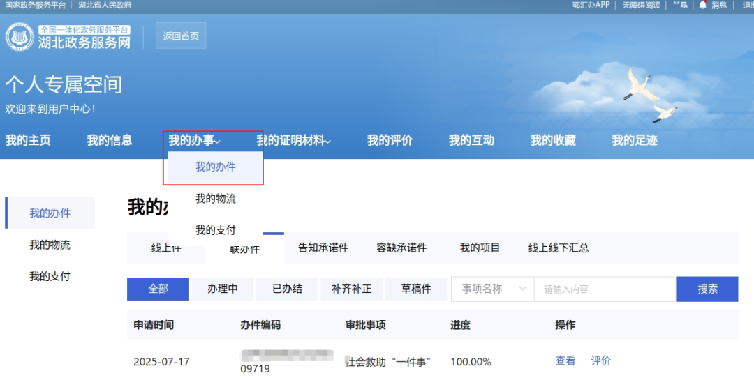 第十一步:办理人员提交完成社会救助“一件事”申报信息后,可通过个人专属空间(用户空间)查看办件进度情况。点击“我的办事”,查看“我的办件”,根据“申请时间”、“办件编码”、“审批事项”查看办件进度。