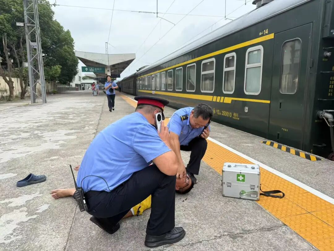 8月11日13时许,武穴火车站一站台上演紧急救援。由贵阳开往烟台的K876次列车在武穴站停靠期间,一名男性旅客突发癫痫倒地,车站工作人员与列车乘务组快速联动,仅用7分钟便帮助旅客转危为安。