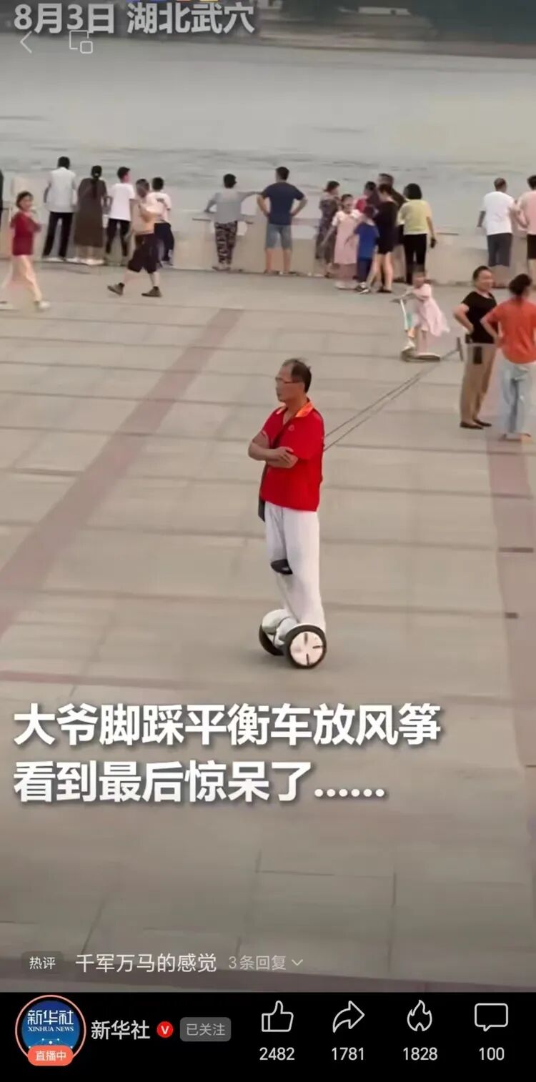 视频里的武穴大爷,为武穴市空竹协会会长宋元洪。他脚踩平衡车放风筝的新奇场景被网友敏锐捕捉并上传网络,瞬间火爆出圈。先是被央视新闻、新华社、人民日报等多家央媒火速转发报道,引发网友的关注。紧接着香港凤凰网、新浪新闻、优酷视频、搜狐网、微博等平台纷纷跟进报道,湖北日报、大众日报、潇湘晨报、济南生活频道等权威媒体持续追踪,手机中国网、快闻播报等线上媒体广泛传播,一时间,相关话题热度居高不下,彻底火遍全国乃至全球。