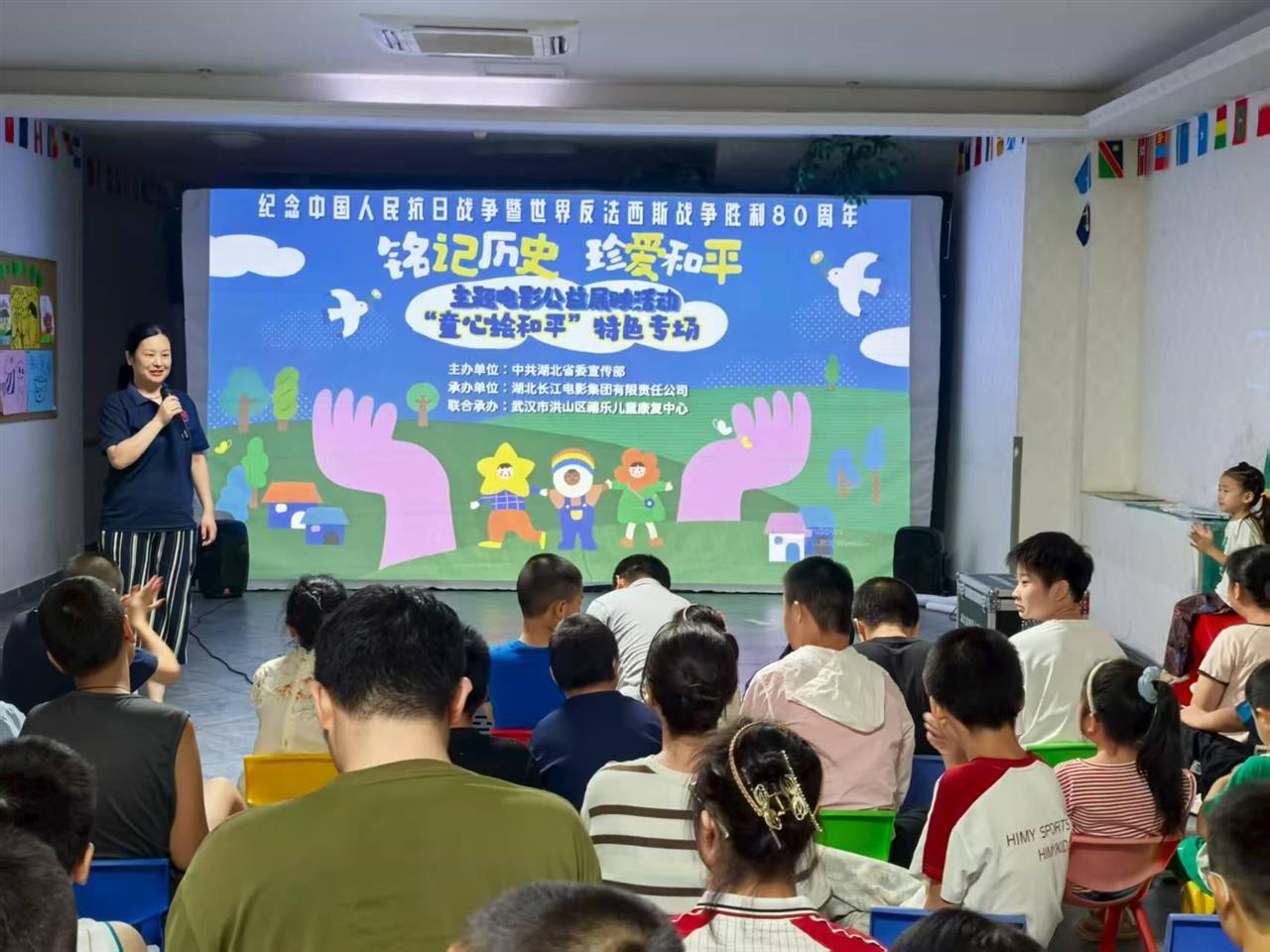 “铭记历史 珍爱和平”主题公益电影展映首站设于武汉市洪山区禧乐儿童康复中心。活动现场,40余组亲子家庭与特教老师共同创作“童心绘和平”画卷。来自康复中心的儿童用白色蜡笔勾勒白鸽羽翼,寓意长江的纯净与和平;以红色丙烯笔描绘飘扬的红旗,并以金色光斑点缀山河画卷,象征着荆楚大地的繁荣与希望。特教老师刘老师动情地表示:“这次活动以艺术为桥,让特殊儿童在表达中感受尊重,在观影中厚植家国情怀。”