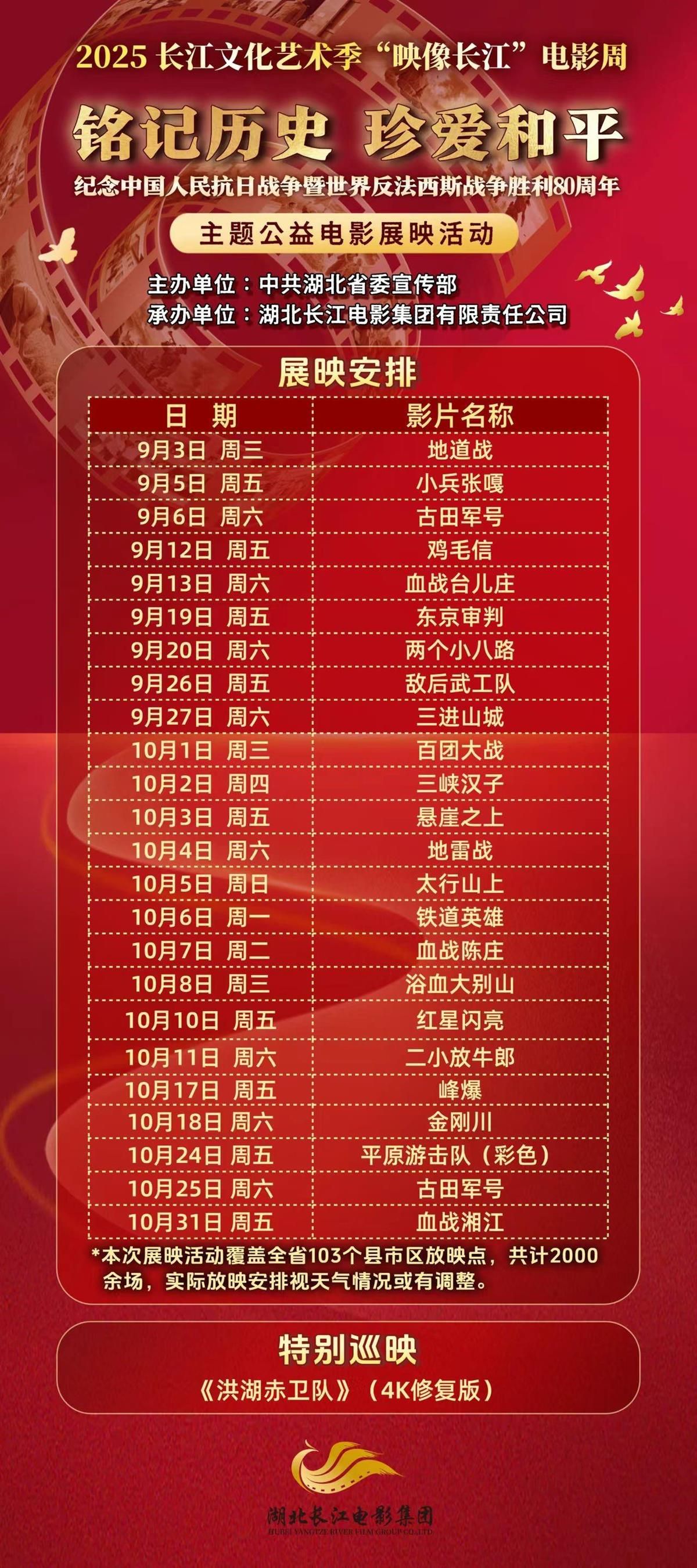 据悉,本次“铭记历史 珍爱和平”主题公益电影展映活动将在全省103个县、区的社区、广场、公园、学校等开展为期两个月的主题电影展映活动,集中展映《平原游击队》《太行山上》《百团大战》等20部优秀抗战题材影片和经典红色电影《洪湖赤卫队》(4K修复版)。通过“流动放映+定点展映”,以光影为纽带,让爱国主义精神在荆楚大地广泛传递,以文化力量赋能湖北支点建设和长江经济带高质量发展。