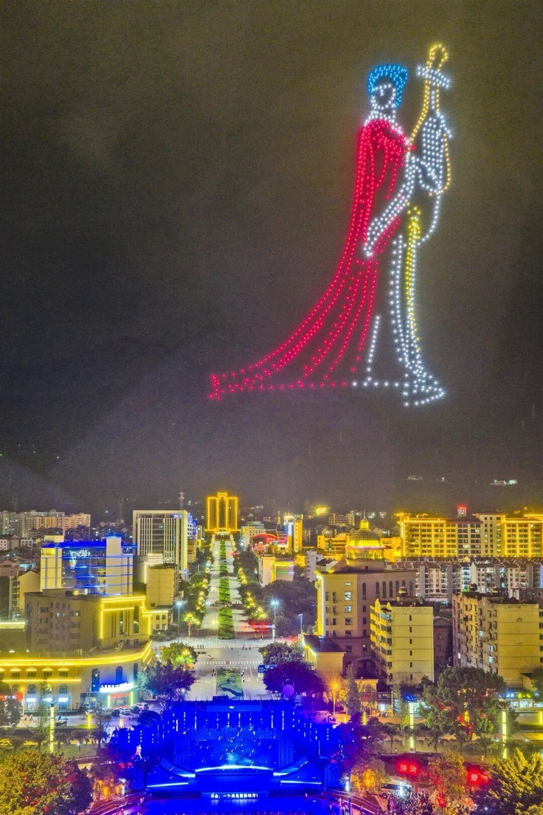 9月28日晚,千架无人机点亮兴山夜空,勾勒出昭君手执琵琶、身披红袍的经典形象,为期三天的昭君文化旅游节随之拉开帷幕。
