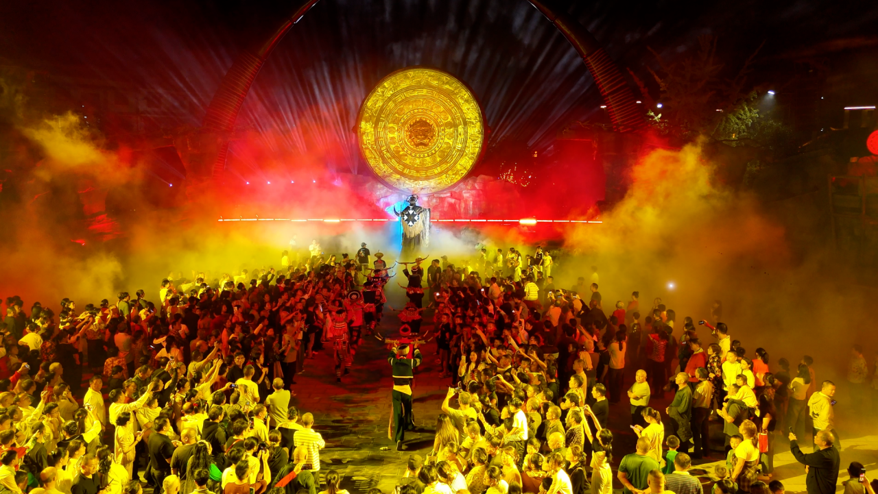 在通城药姑山古瑶村,以瑶族迁徙史为脉络的大型沉浸式民族史诗实景演艺《瑶望千年·云歌》国庆期间上演,这场以山水为舞台的实景演艺激活古瑶村夜游,实现“演出一场、点亮一夜”的联动效应。
