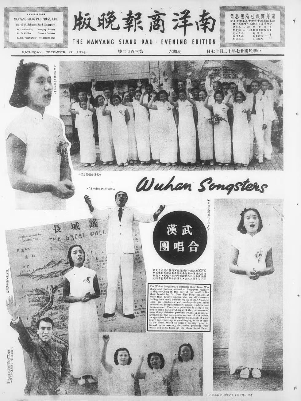 在时任中共长江局负责人董必武的帮助下,1938年9月,武汉合唱团一行28人从武汉启程,途经广州、澳门、香港,于12月抵达新加坡。在爱国侨领陈嘉庚的支持下,12月18日晚,武汉合唱团在新加坡大世界游艺场进行首场试演。