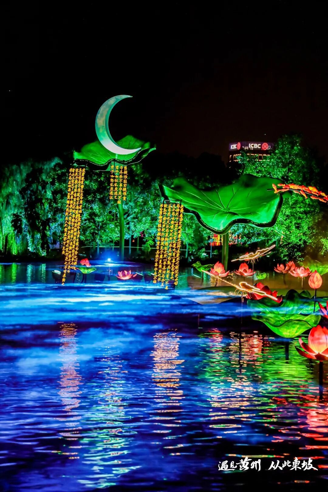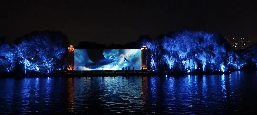 以“庭下如积水空明”为场景创意主题,打造40米长水上光影浮台,上设两处虚实结合的 1 万流明莎幕投影造景装置,联动两台4万流明九曲桥桥体mapping秀,形成户外水上剧场,还原夜游承天寺的美学场景。月光如水,竹柏影斑驳,游客乘船穿行其间,仿佛与苏轼、张怀民共赴那场千古夜游,在静谧中体悟“闲人”的豁达与通透。
