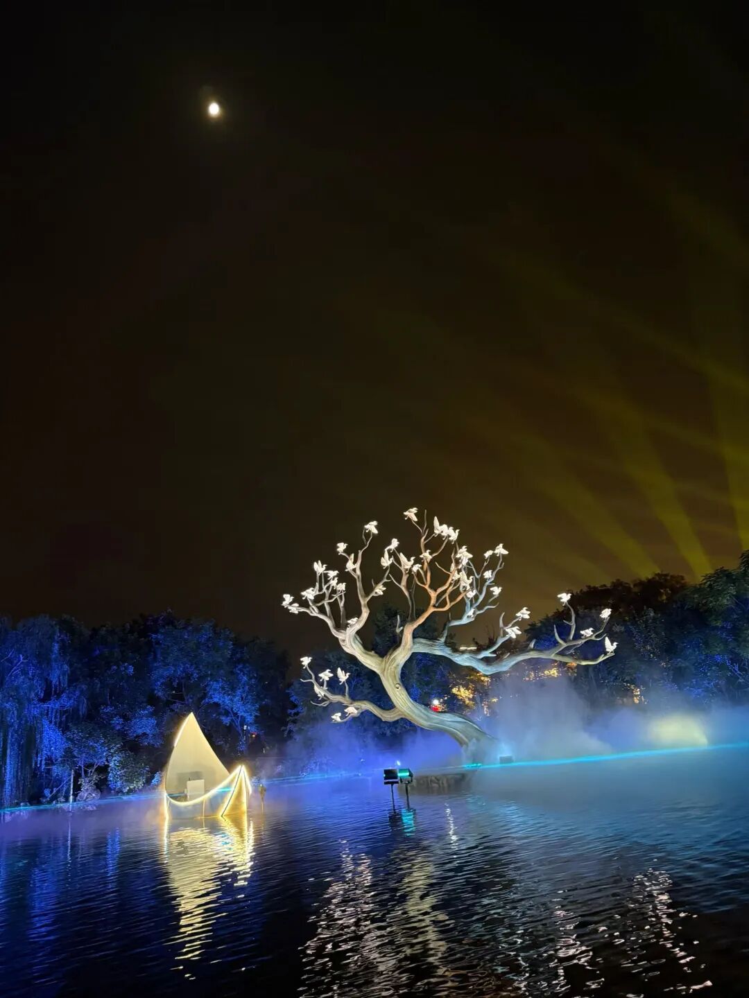 以“拣尽寒枝不肯栖,寂寞沙洲冷”为场景创意主题,12米高15米长水上发光造型神树装置、5.3米长5.2米高 3 米宽的电动伴游月亮船、一组高2米孤鸿装置与45组光影飞鸟装置,还原寂寞沙洲冷的意境,配合明暗交替如呼吸般的光影韵律,精准还原苏轼谪居黄州初期的孤寂,体验其“惊魂不定”的“惊鸿”时刻。