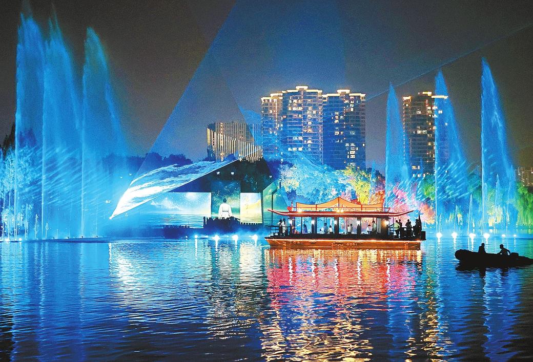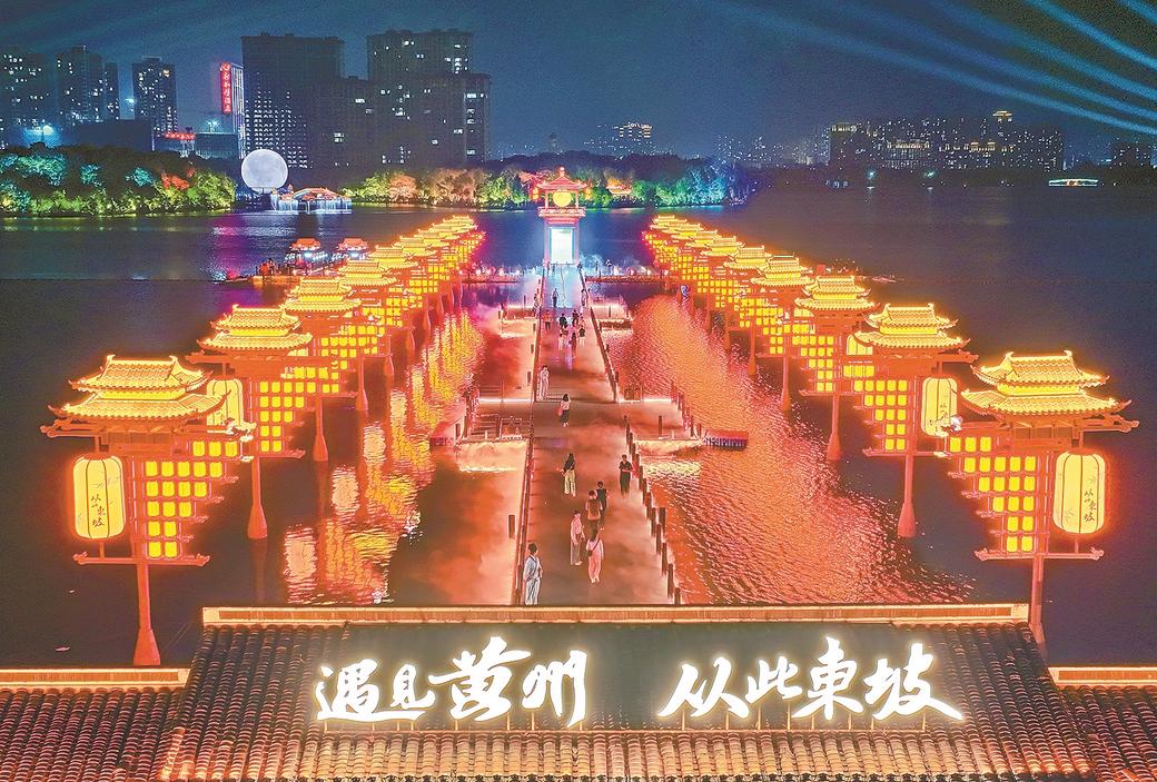 遗爱湖推出全国首个东坡文化沉浸式夜游项目“从此东坡”,千架无人机以夜空为幕勾勒“大江东去”意境,非遗打铁花在湖面绽放,游客乘船穿行于“一湖两岸八大场景”,在桨声灯影中完成“穿越千年的文化对话”。这一创新场景先后被央视《24小时》《国庆中秋假期・出游》等栏目聚焦报道,成为全国夜游经济的典型案例。
