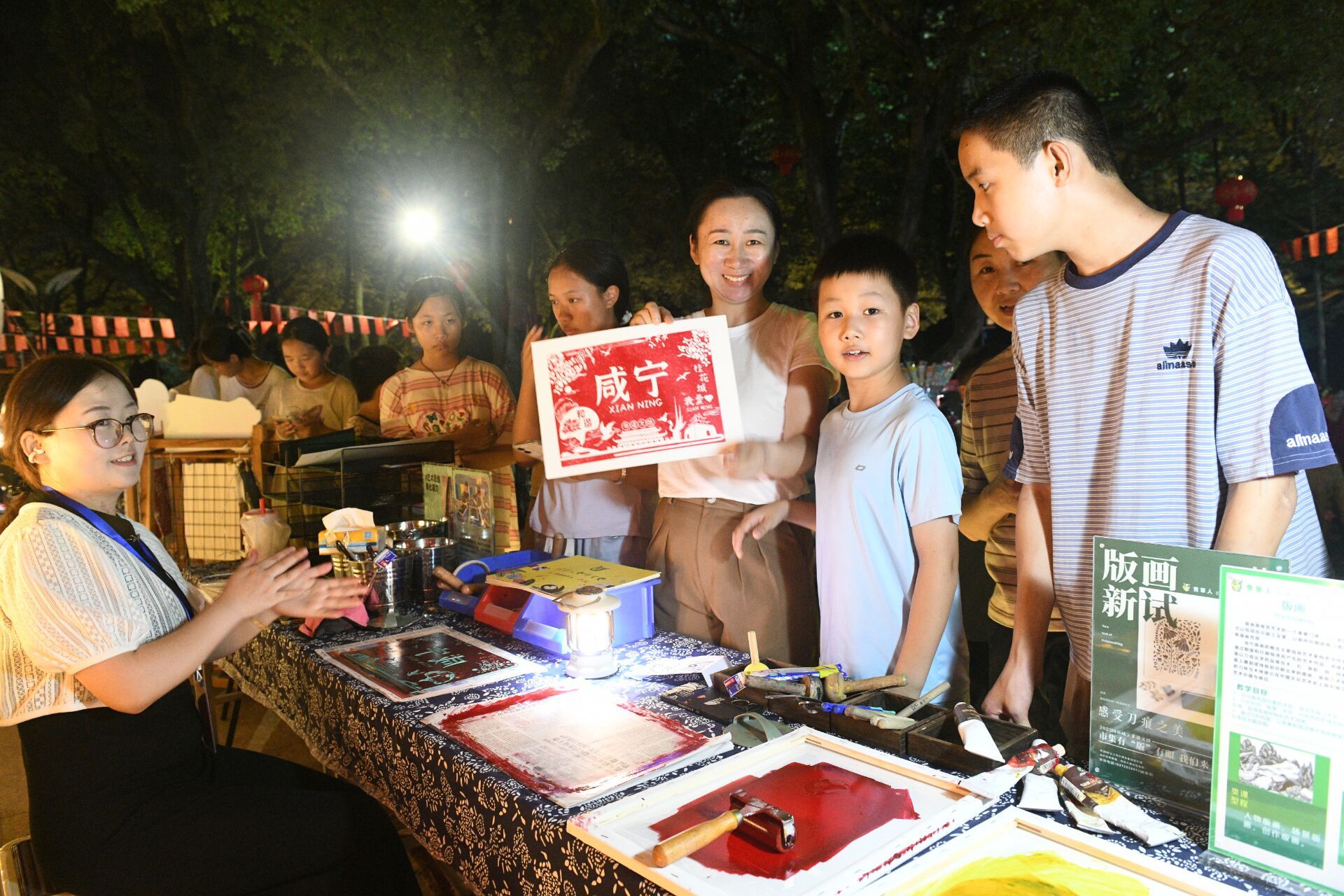 文创市集上,还有“市民与专家共创”的环节。有人跟着老师学雕版拓印,印出“幸福咸宁”的版画,免费带回家;有人参与书法飘漆扇制作,把自己写的字印在扇子上,成就感满满。