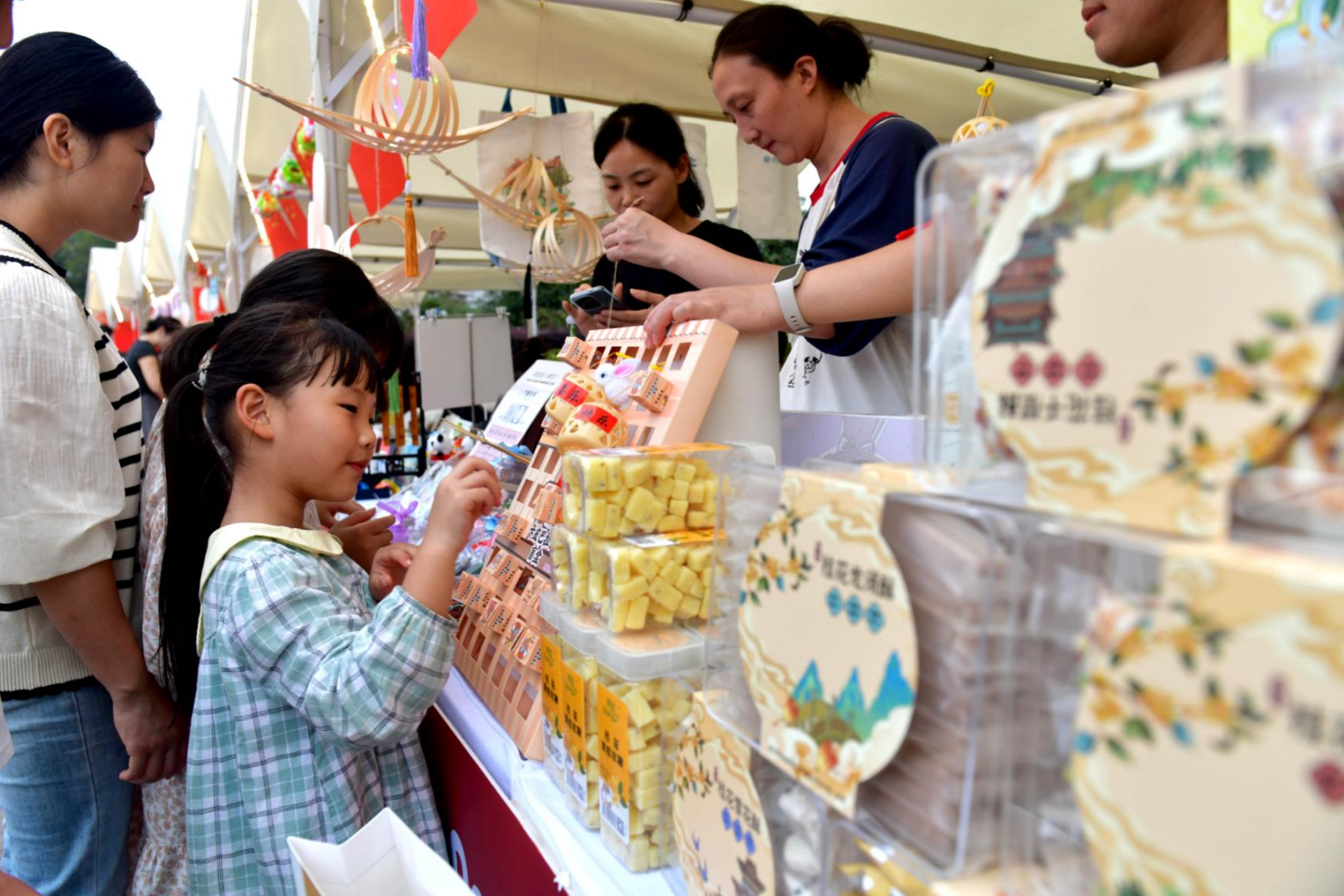 “带点特产回家”。在市人民广场、月亮湾街区,咸宁文创市集备受关注,贺胜鸡汤、桂花糕、青砖茶等成了“香饽饽”。