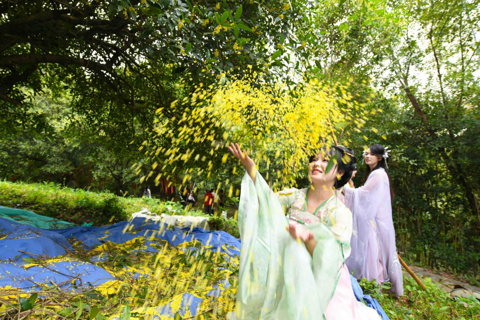 咸安桂花镇的花农,国庆期间忙着打桂花、卖桂花。明星村村民何汉平卖了一袋桂花,得了576元。他笑着说:“今年桂花长得好,收购桂花的老板也多,我们也能多赚点。”