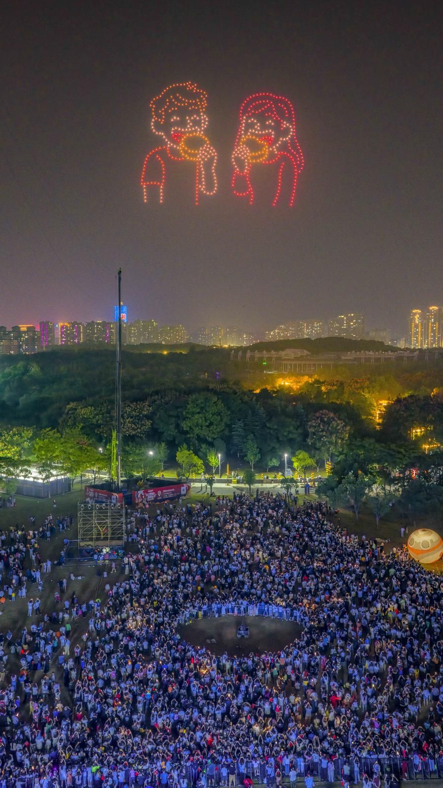 木兰草原每晚6时起,千架无人机在夜空中变幻出璀璨图案,为游客打造火树银花不夜天的沉浸式体验。