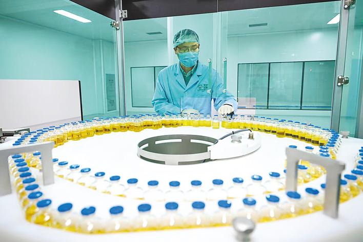 在武汉禾元生物公司生产车间里,“稻米造血”药品正在下线。 (湖北日报全媒记者 朱熙勇 摄)