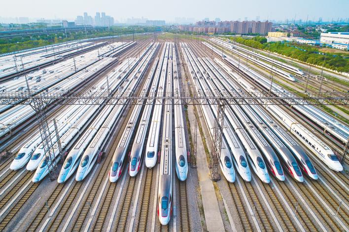 武汉动车段近百组动车组整齐停放,蓄势待发。(湖北日报全媒记者 任勇 摄)