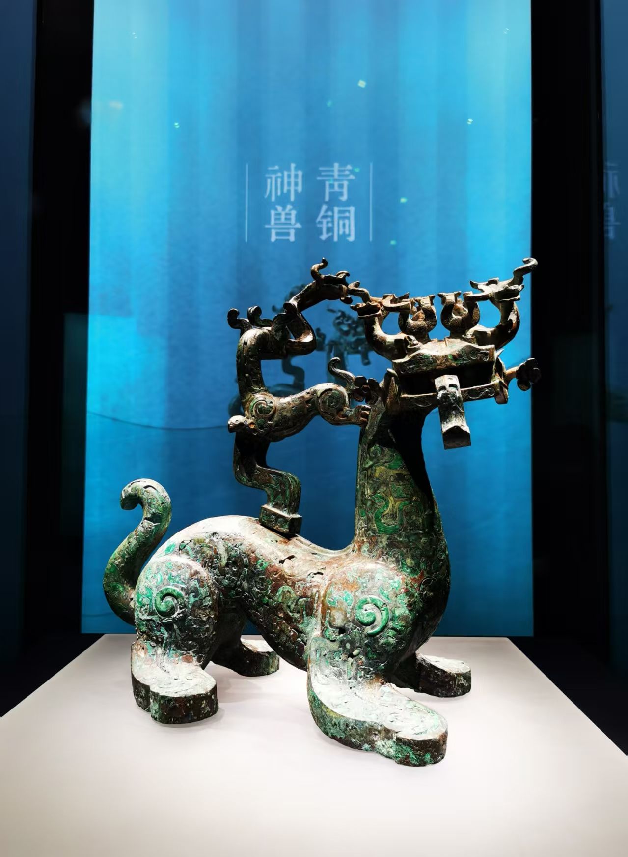 同样来自河南南阳的青铜神兽,以其独特的外观和精巧的工艺,令参观者赞叹不已。神兽为龙首、蛇颈、虎身、龟足、豹尾,双目圆睁,牙齿锋利,给人以既凶猛又可爱的印象。头部以6只小龙构成角,背部还攀附着一只小兽,整体造型十分灵动。它是楚文化艺术风格的突出代表,反映了楚人丰富而浪漫的想象力,也展示了古代工匠高超的青铜铸造技艺,堪称春秋时期楚国青铜器的巅峰之作。
