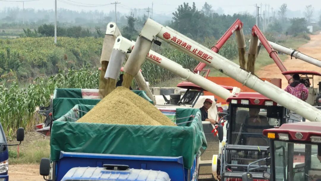 走进万丈湖街道的连片虾稻田,首先映入眼帘的便是满眼金黄。田间,十余台大型收割机呈梯队同步作业,切割、脱粒、秸秆粉碎一气呵成,金色的稻穗在机器“吞吐”间快速变成颗粒饱满的稻谷,随后顺着输送管道装入随行的运输车辆,不一会儿,车厢便堆起了金灿灿的“小山”。