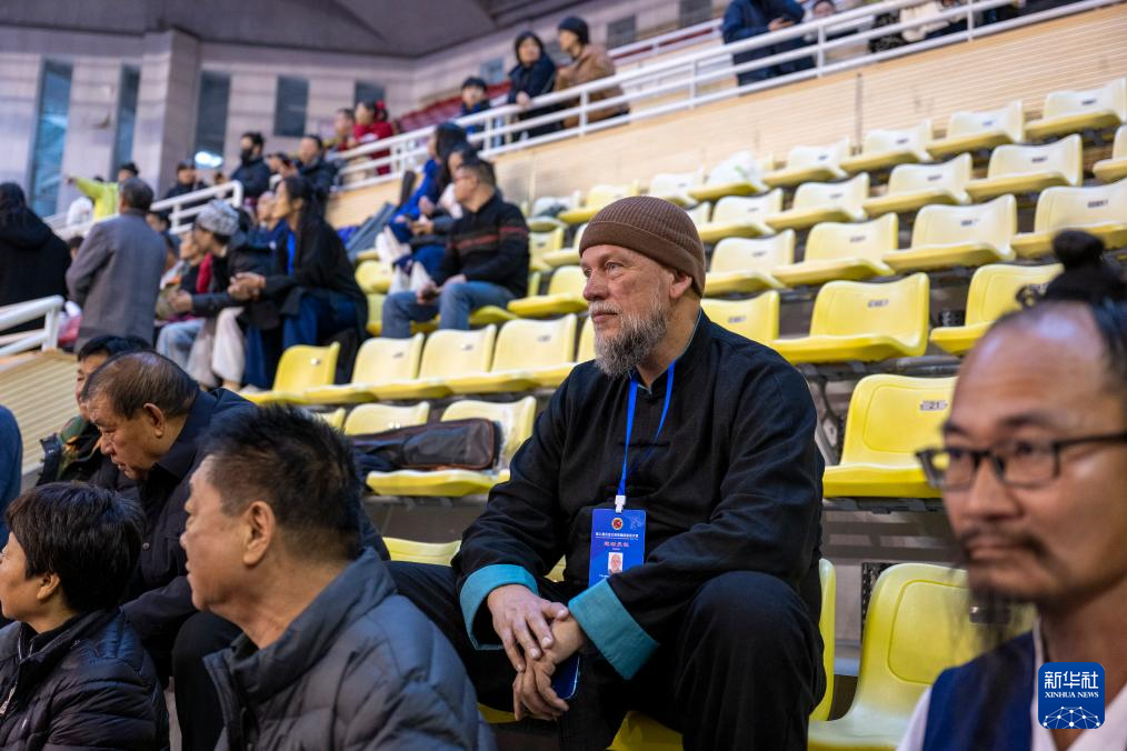 10月24日,在湖北省十堰市武当国际武术交流中心,53岁的德国工程师托马斯(右二)在观看太极比赛。新华社记者 伍志尊 摄