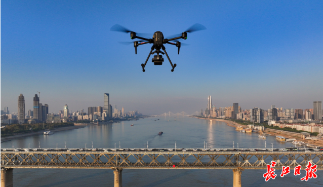 普宙科技无人机在武汉长江大桥上空往上、下游方向进行测绘、巡检。 长江日报记者胡冬冬 摄