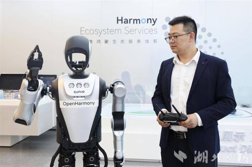 10月28日,鸿蒙生态(武汉)创新中心的智慧展厅,全球首台搭载开源鸿蒙系统的机器人惊艳亮相,吸引不少参观者与其互动。
