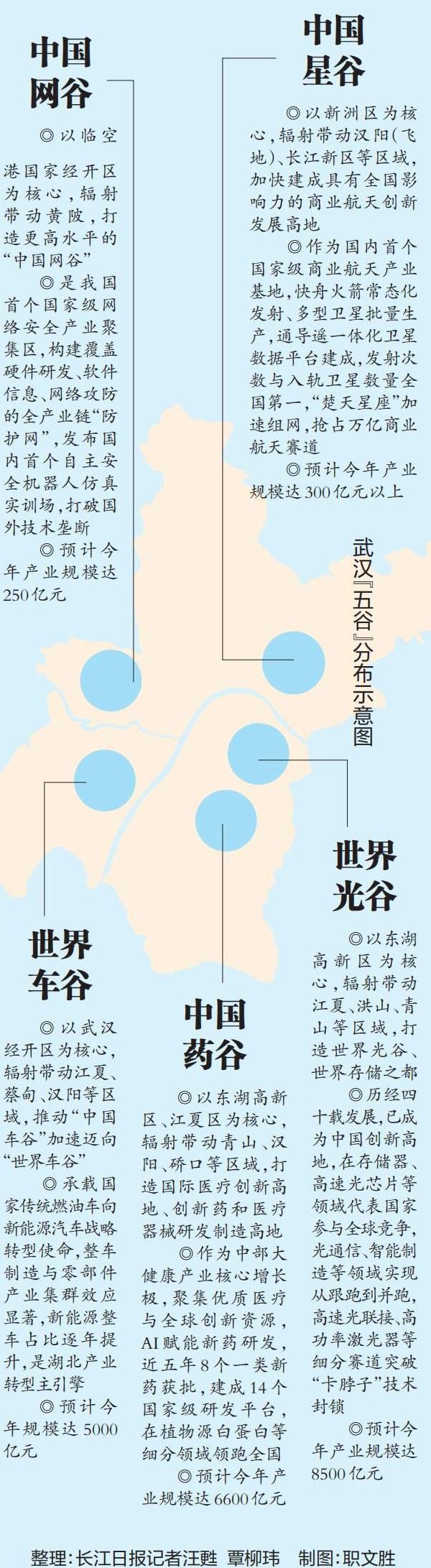 如今,光谷聚焦光电子信息、集成电路等领域,打造世界光谷、世界存储之都;车谷深耕新能源与智能网联汽车、汽车芯片等领域,迈向“世界车谷”;网谷筑牢网络安全防线,打造更高水平的“中国网谷”;星谷冲刺商业航天创新发展高地;药谷则瞄准国际医疗创新高地、创新药和医疗器械研发制造高地。