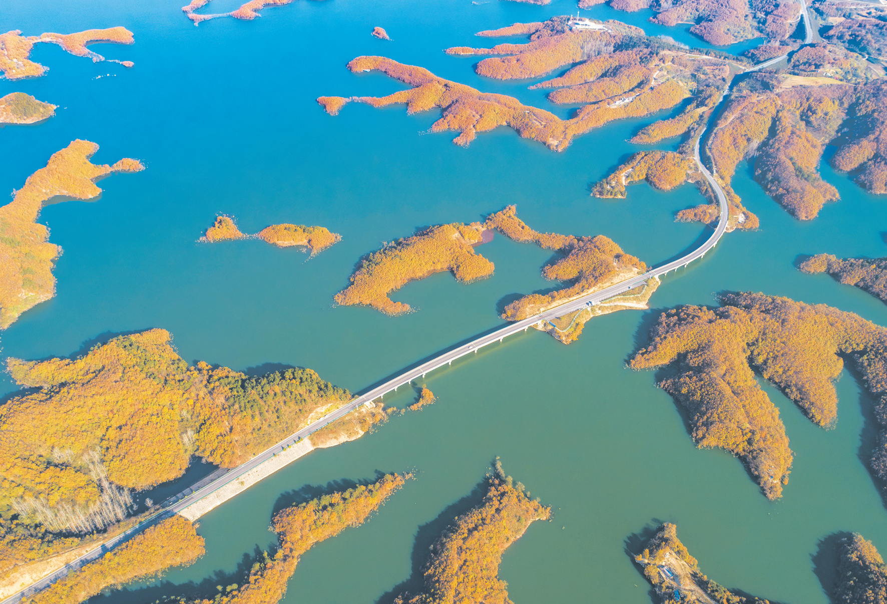 冬日的丹江口库区,山峦层林尽染,库面澄澈如镜,山水交融,美如画卷。记者 刘昆 摄