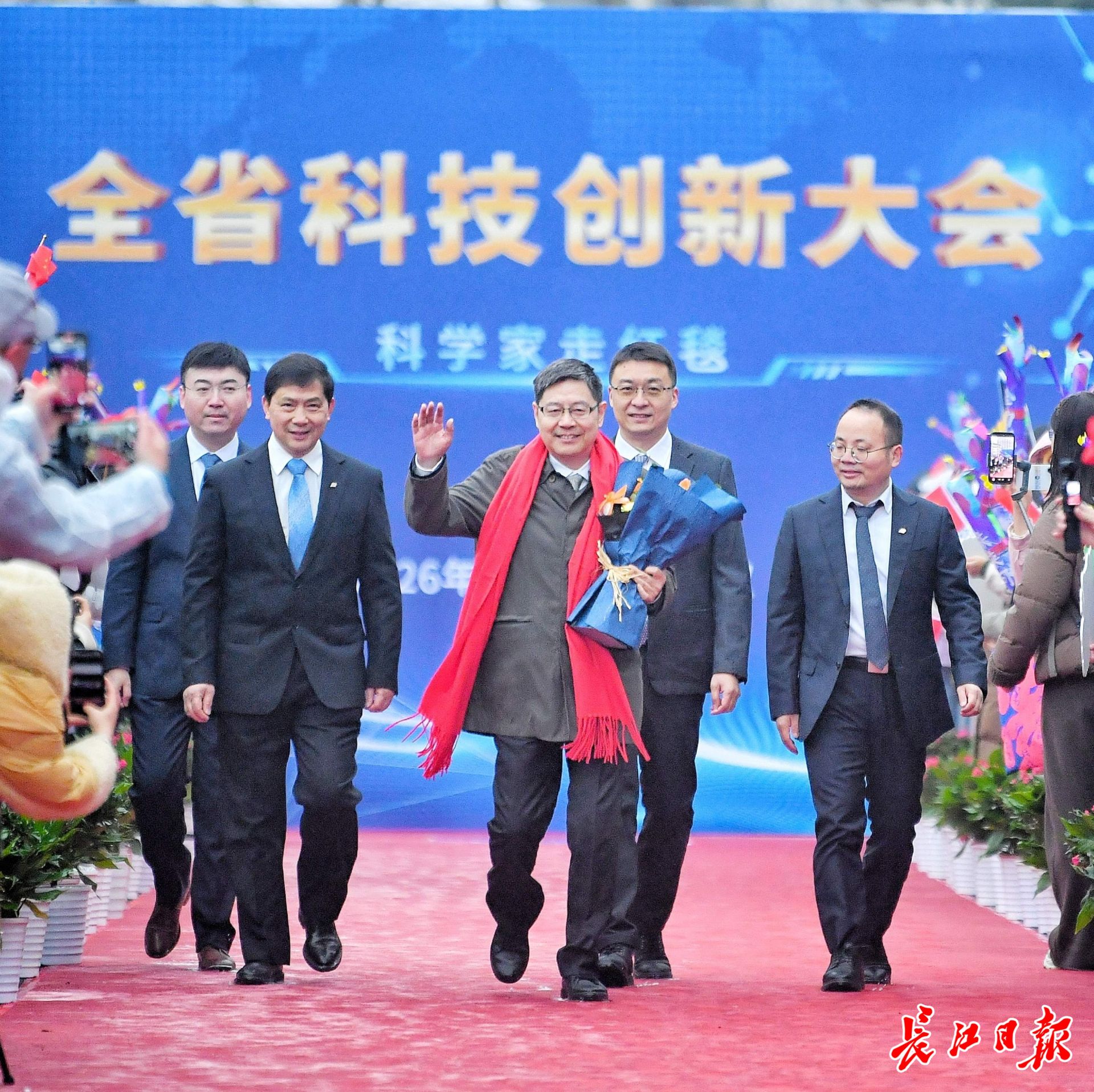 长江日报大武汉客户端1月4日讯 1月4日,湖北省科技创新大会在武汉举行。举办大会的洪山礼堂外,一条百米红毯铺就星光大道,在鲜花簇拥中,12位“科学之星”款步而来。这已是湖北省科技厅“科学家走红毯活动”第七年绽放荆楚,见证着湖北科技创新的蓬勃脉动。