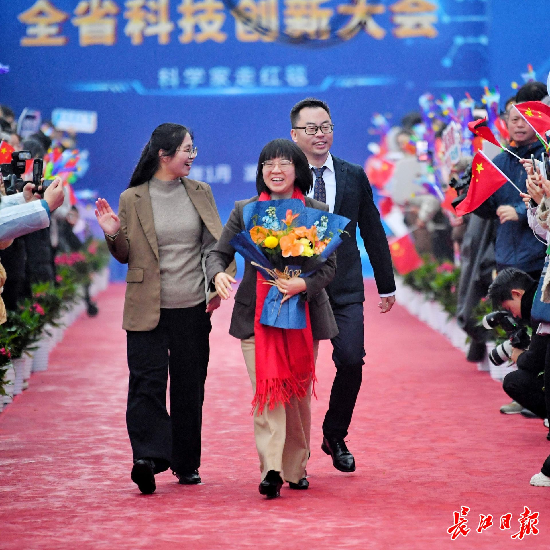 华中农业大学教授,2025年度湖北省青年科学创新奖获得者高泽霞(持花束者)走上红毯。